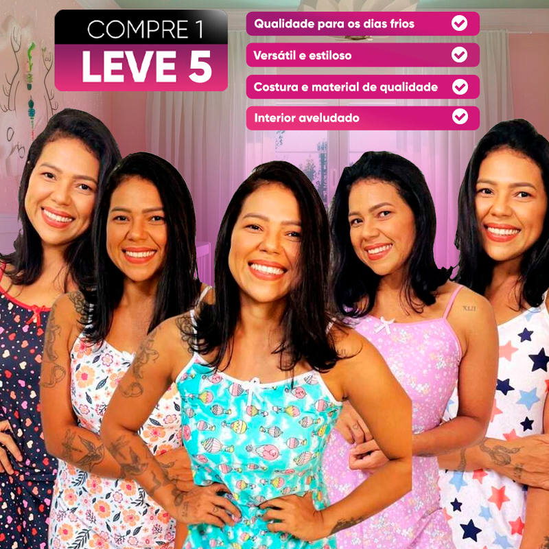 Isso mesmo, você leva 5 pijamas incríveis pagando o preço de apenas 1! Um verdadeiro presente para você e para o seu bolso, garantindo noites mais confortáveis e estilosas.