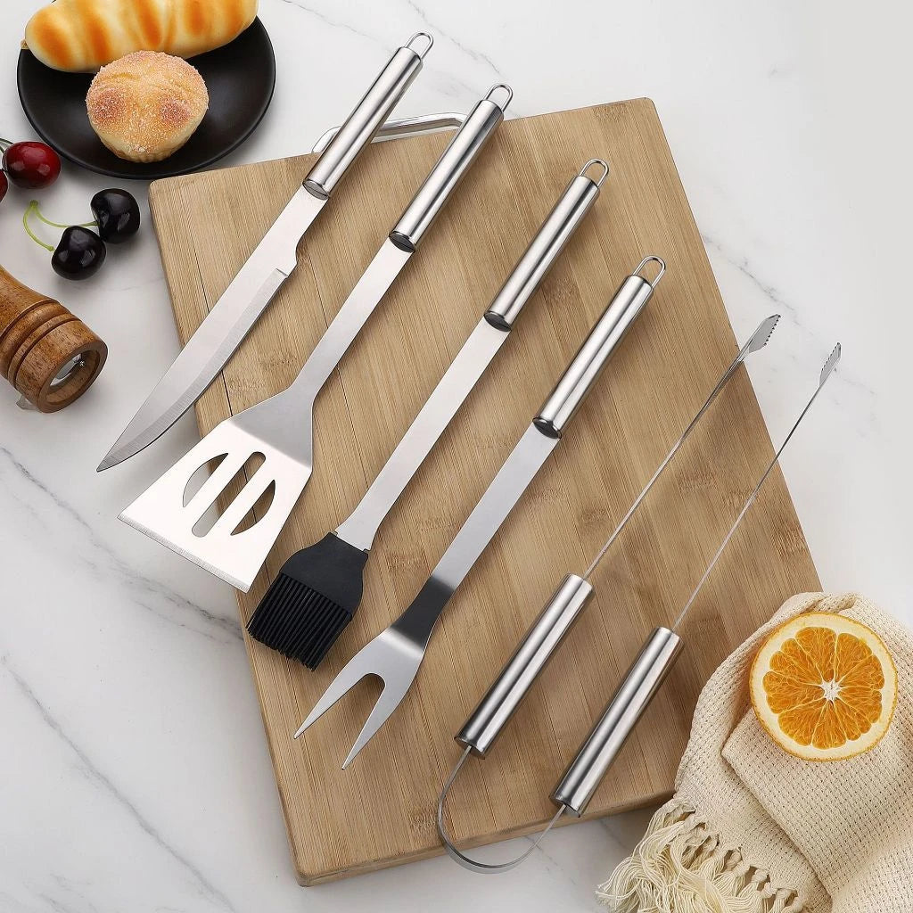 Eleve sua experiência de churrasco com nosso conjunto de 5 peças em aço inoxidável: durabilidade e precisão para cada corte.