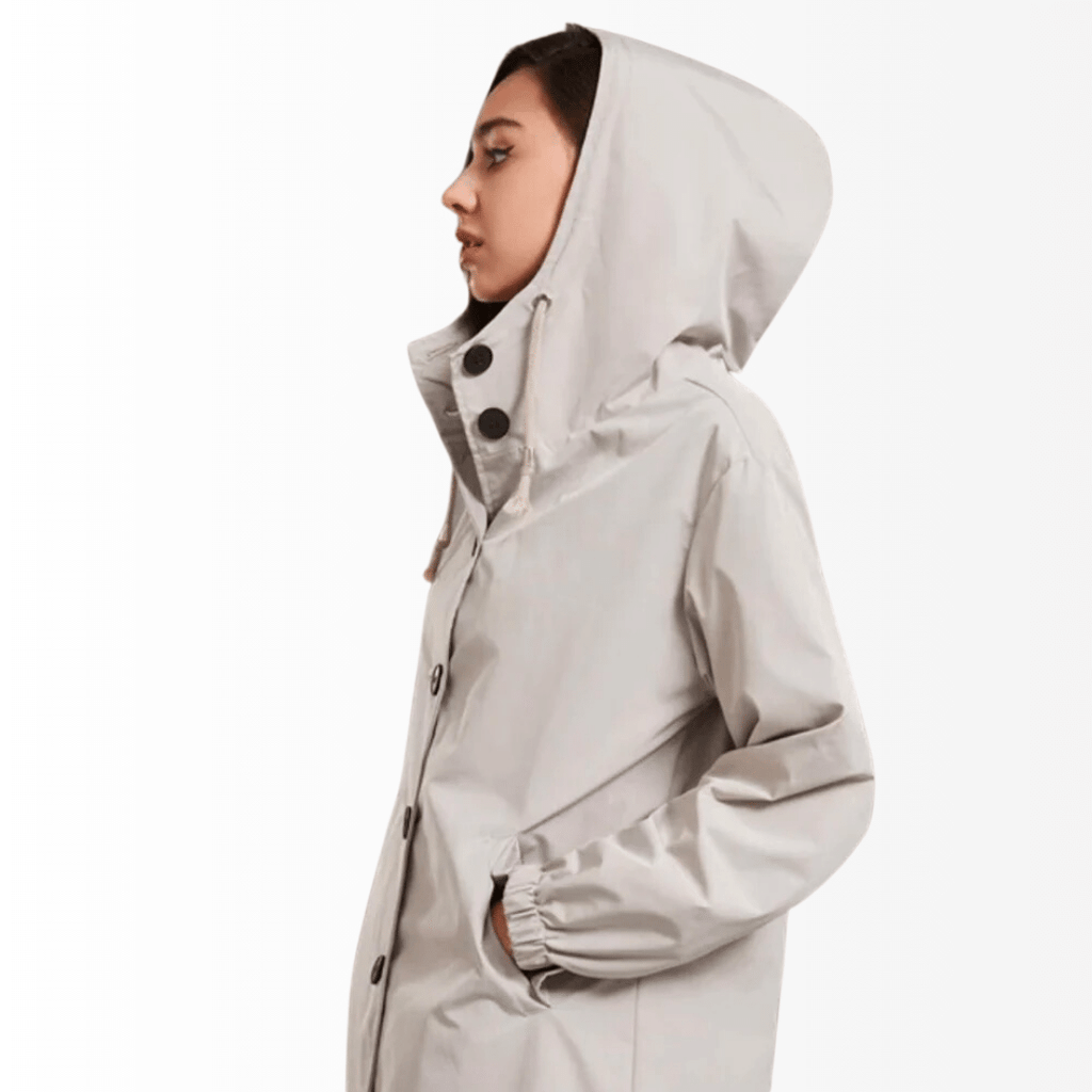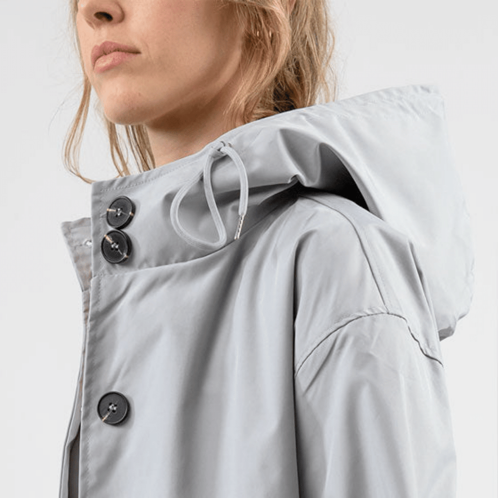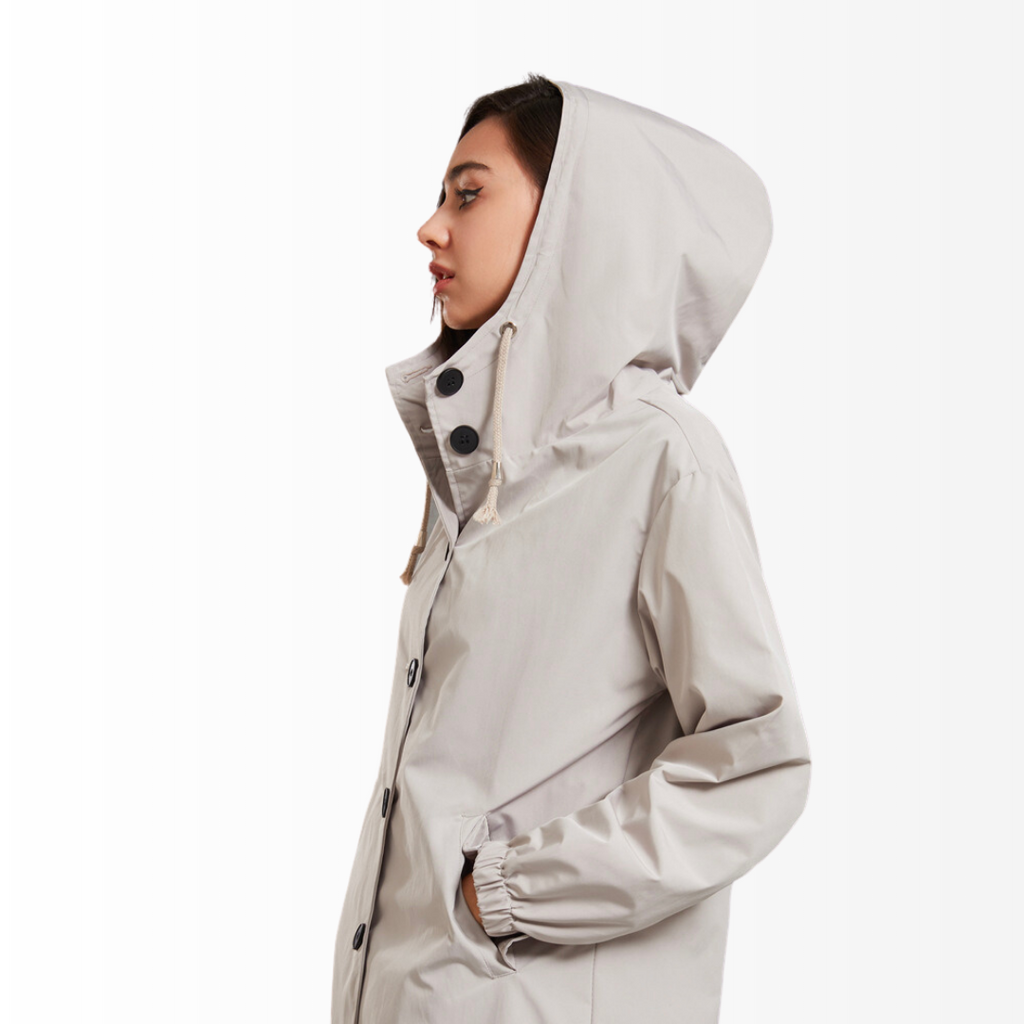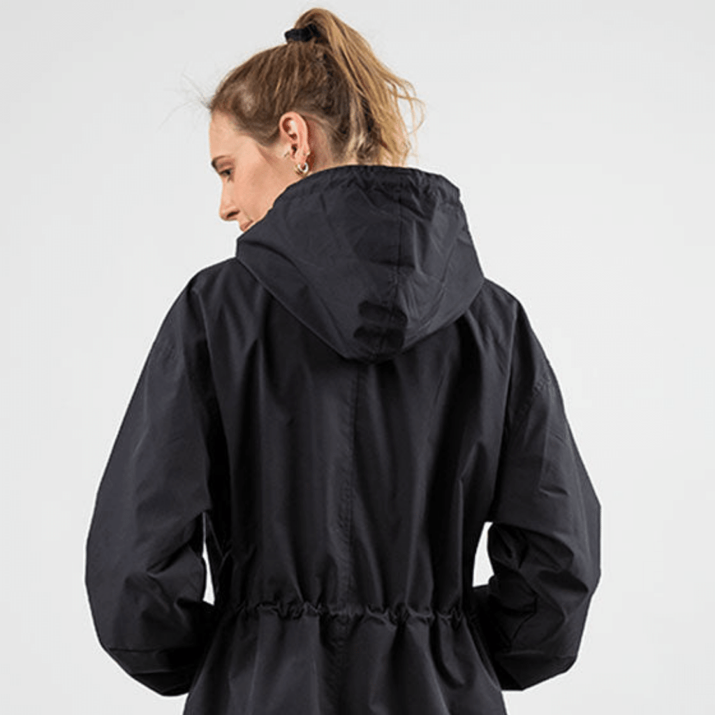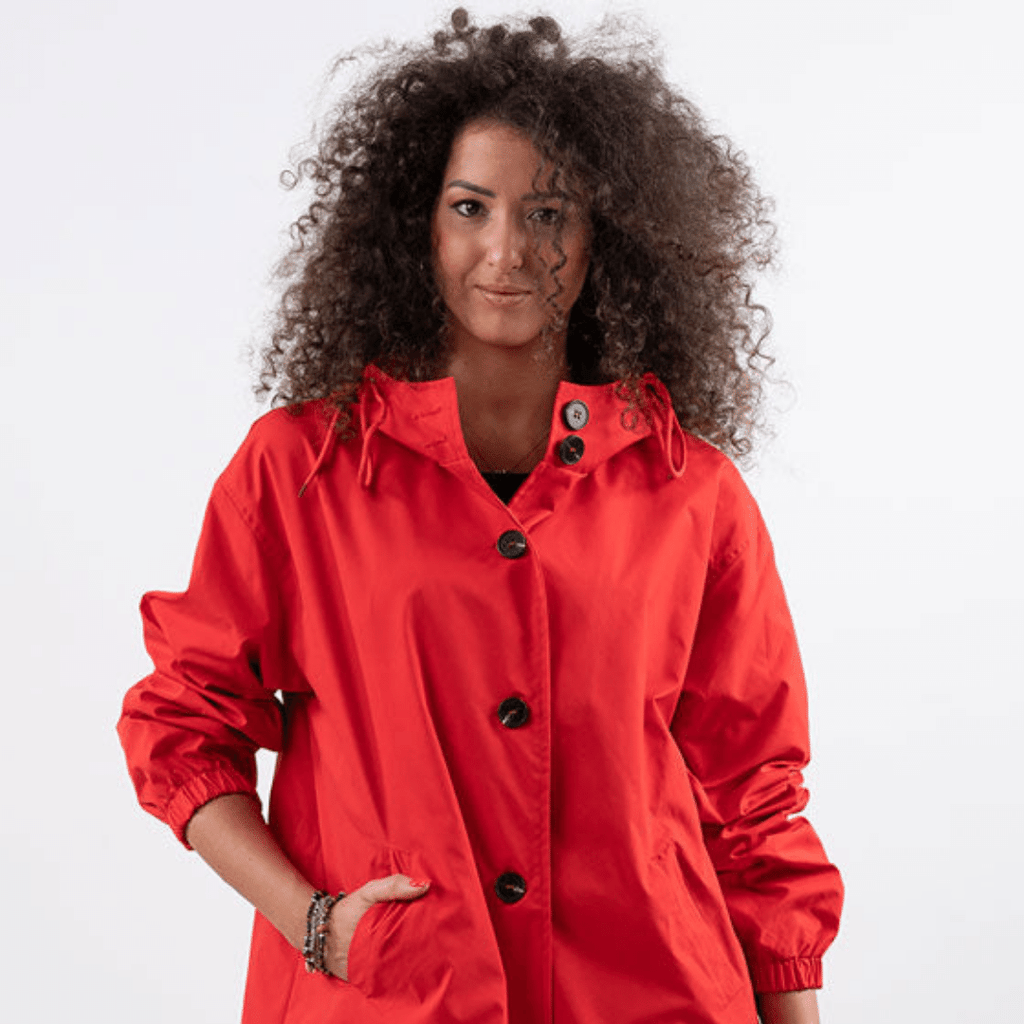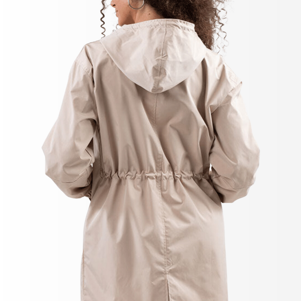 Casaco Corta Vento feito com um tecido impermeável à água, perfeito para aqueles dias chuvosos e com vento. Possui um caimento oversized, capuz, dois bolsos frontais, cordão embutido na cintura para o ajuste perfeito no seu corpo e fechamento por botões frontais.