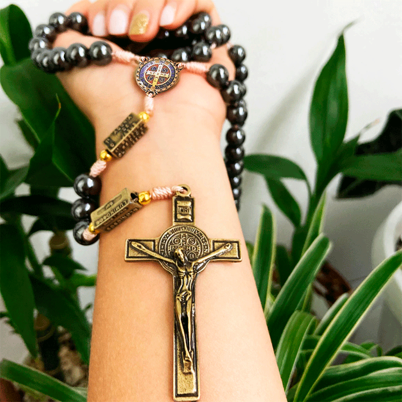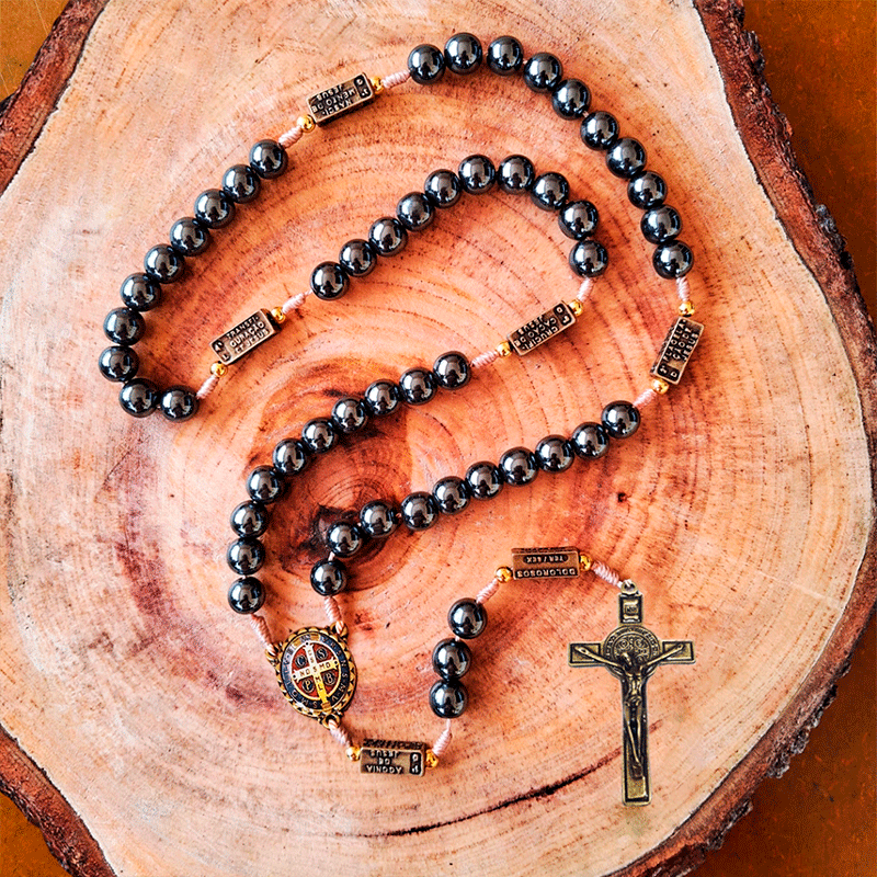 Além disso, o Terço é personalizado com a medalha de São Bento , um poderoso sinal de proteção contra o mal e das vitórias divinas. Sinta-se envolvido pela presença amorosa de São Bento enquanto recita suas ou ações diárias.