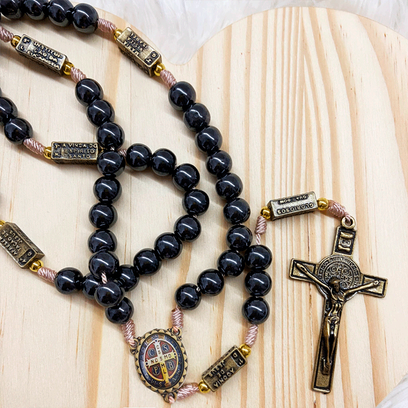 Feito com pedras de Hematita , conhecido por suas propriedades de equilíbrio e proteção , este Terço é mais do que uma simples joia, é um símbolo tangível de sua fé e devoção.